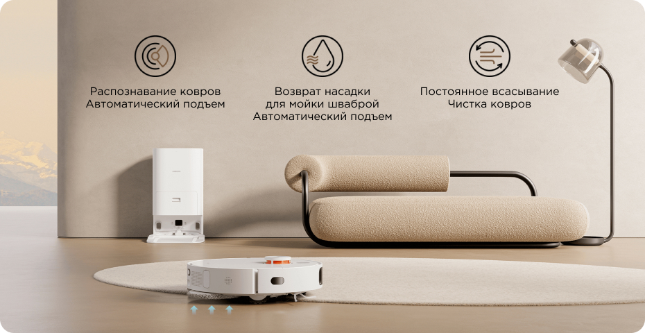 Ультразвуковое распознавание ковров автоматически поднимает подушечки, чтобы не намочить ковер, и включает дополнительную мощность всасывания при удалении пыли. Возврат для цикла мытья швабры также активирует автоматическое поднятие накладки, чтобы избежать вторичного загрязнения.